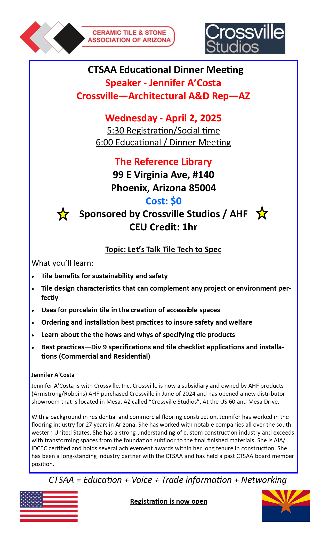 Jennifer A’ Costa is with Crossville, Inc. Crossville is now a subsidiary and owned by AHF products (Armstrong/Robbins) AHF purchased Crossville in June of 2024 and has opened a new distributor showroom that is located in Mesa, AZ called “Crossville Studios”. At the US 60 and Mesa Drive.
