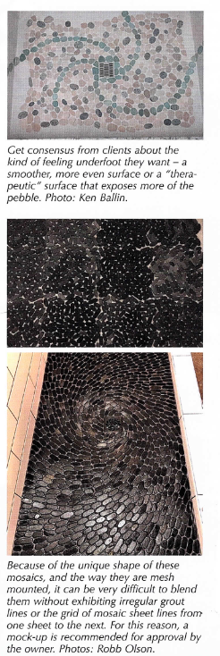 Jim Whitfield FCSI, CCPR, AP LEED, Director de Servicios Técnicos I de MAPEI, encabezó este comité, que también incluía a Dirk Sullivan, Azulejo de espino; dan lamberto, Azulejo Lambert & Roca; dave rogers, LATICRETE, y joe kerber, Mármol KerberTile & Roca. This particular paper has been in the works for about a year and a half and through several revisions. Whitfield dijo que enfatiza la importancia de tener un instalador de baldosas de calidad que haga el trabajo., y pelear con formas irregulares en el respaldo de malla, el espectro de líneas de hoja que a menudo pueden ocurrir, y obtener el consenso de los clientes sobre el tipo de sensación que desean bajo los pies: una sensación más suave, superficie más uniforme o una “terapéutico” surface that exposes more of the pebble.